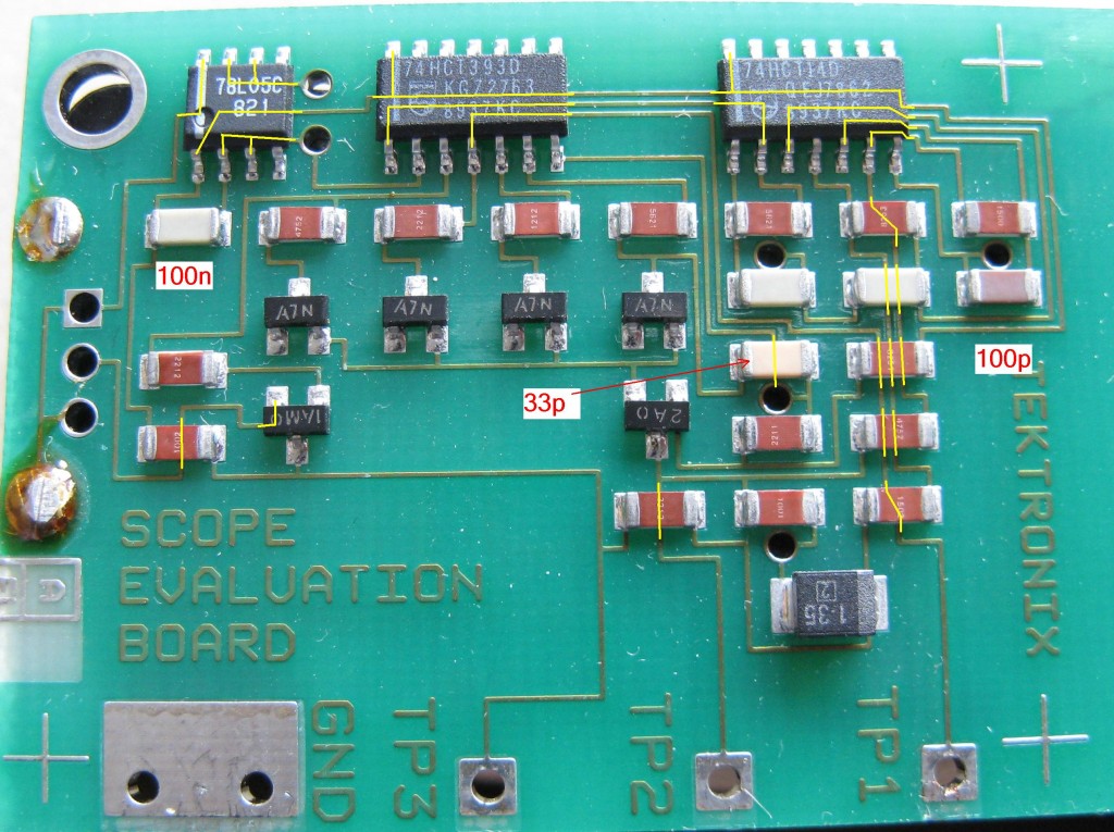 Dit was een project via Circuits online maar vooral via de Tekscopes group. Een Tek groep lid ging zelf zover om zijn board gedeeltelijk van componenten te ontdoen ivm foto’s en nameten van componenten waarden. Langzaam maar zeker ontstond zo het schema wat ik (en nog wat andere) heb na gebouwd.