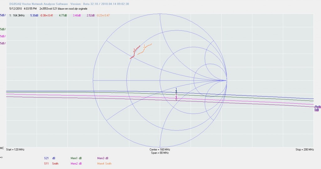 Eerst de VNA test. De rode smith trace en de blauwe S21 zijn van de “originele” tor