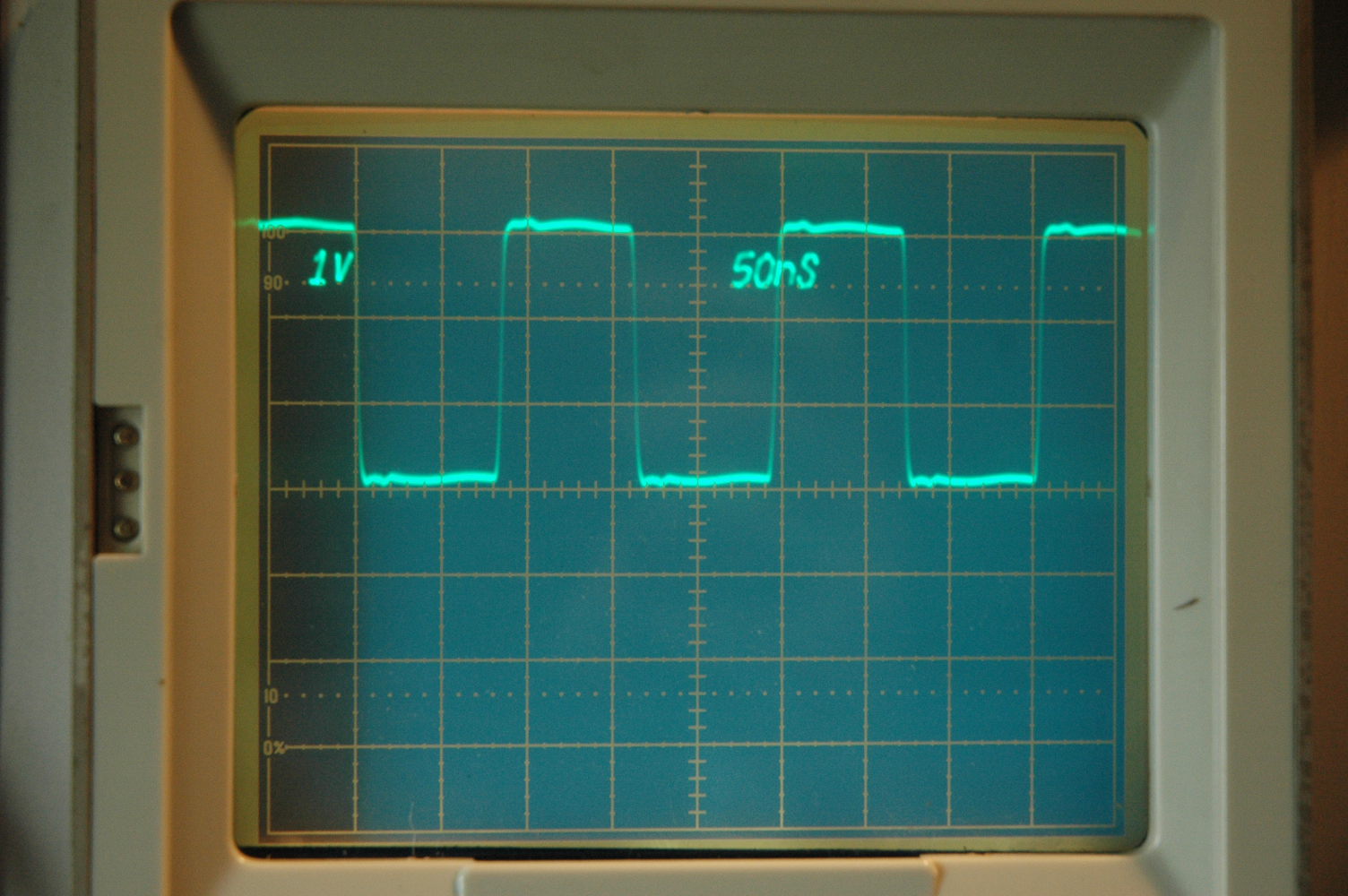 Dit is een 6MHz blok van ongeveer 3Vtt gemeten met een hi-Z probe en 50x verzwakker kop. Gecontroleerd met een andere scoop die voor de 50 ohm terminatie zorgt. De Hi-Z veranderd niets aan het beeld van het signaal.