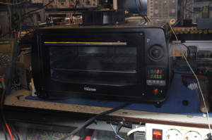 It uses two resistive heaters in serie. The temp is controlled by a PID controller. On top you see a fan. This cools the oven if needed so I can cool it faster. It scuckes cool air in through holes in the bottom, via the room between inner and outer cabinet to the top.