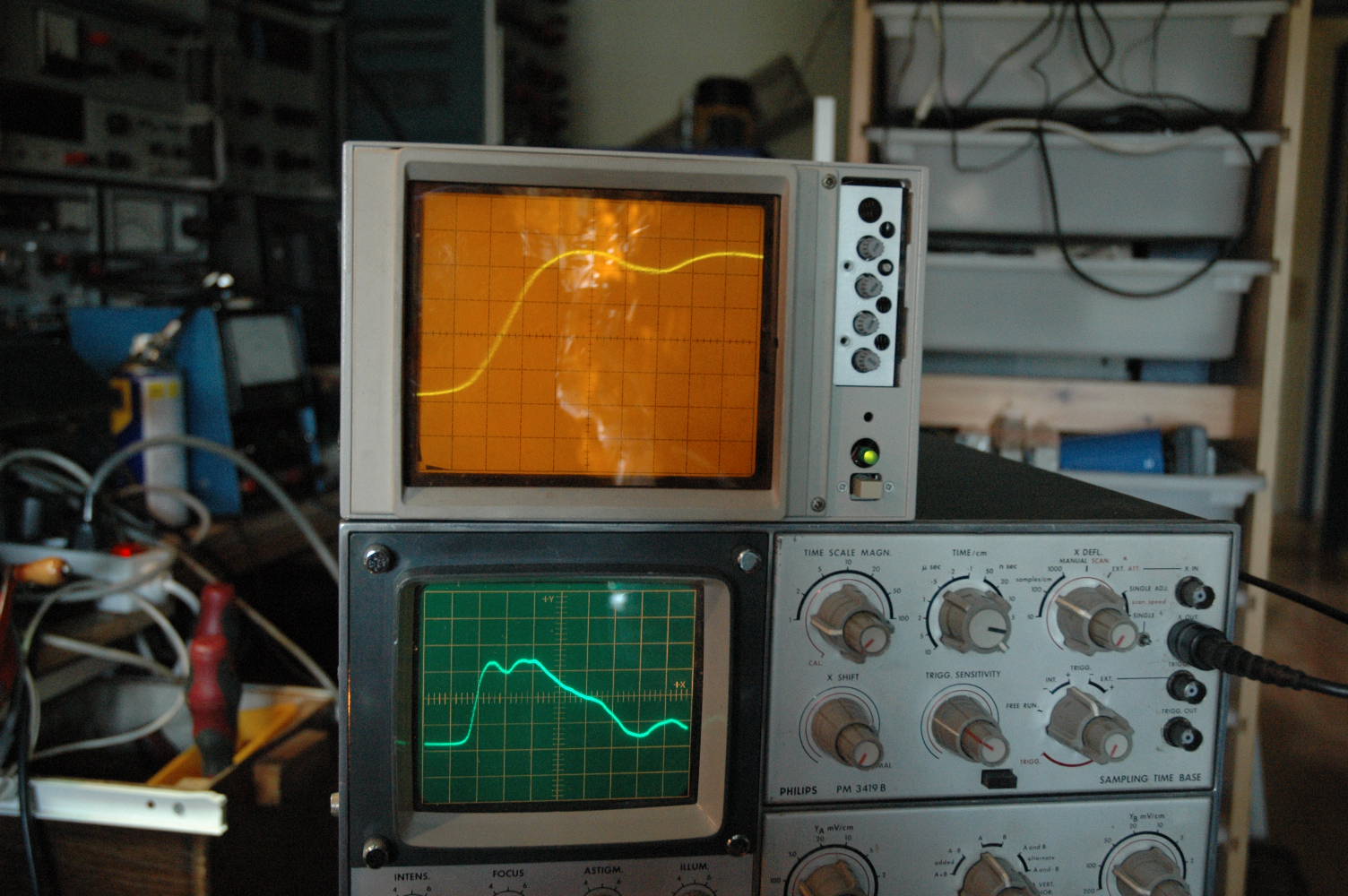 This is a Tek 700 series XYZ monitor. It had a P7 CRT and options 1-22 and 28-76. Insite are switchtes and two potentiometers to regulate deflection (5x and vernier). It was mounted to a Bruker ER001 spectrometer timebase. To bad they removed the frontpanael for that. It is in this picture coupled to a sampling scope. This is before I adjusted deflection to get the same proportions as on the Philips.